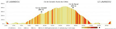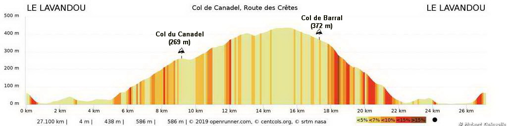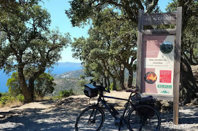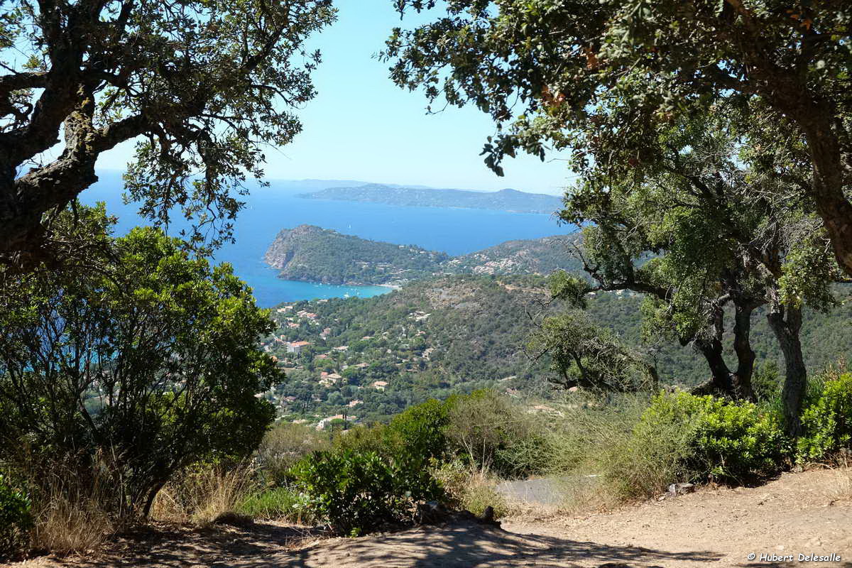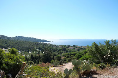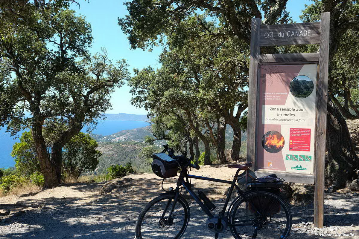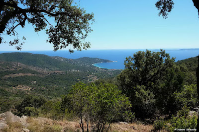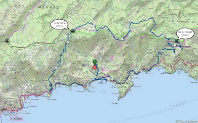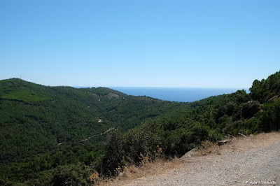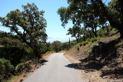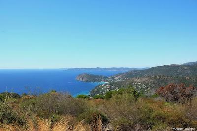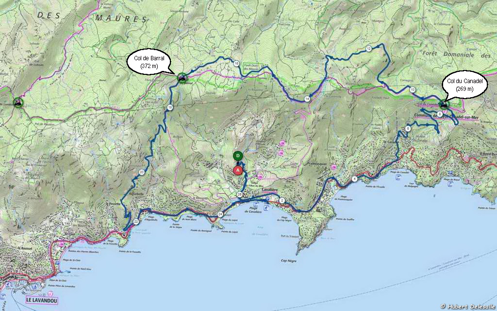 Je quitte Cavalière, par la voie verte du littoral, je rejoins Le Rayol et monte vers le col de Canadel (269 m) par une très belle route en lacets surplombant le Cap Nègre, puis la route s'engage vers l'ouest par la route des Crêtes pour rejoindre le col de Barral avant de redescendre sur Le Lavandou.