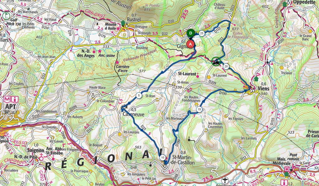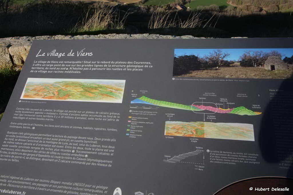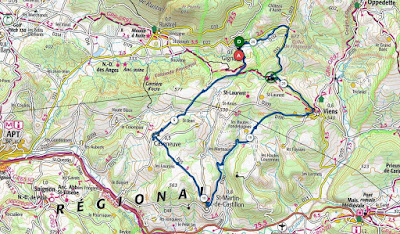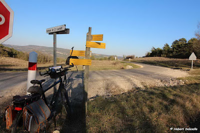 En cette belle fin d'après-midi, randonnée vélo au départ du minuscule village de Gignac, dans le Colorado Provençal, la partie orientale du massif des Ocres. Peu d'ocres à voir ! Mais on peut découvrir le secret de leur formation et quelques autres sites géologiques ; avec en toile de fonds les villages perchés de Caseneuve, Saint-Martin-de-Castillon et Viens.