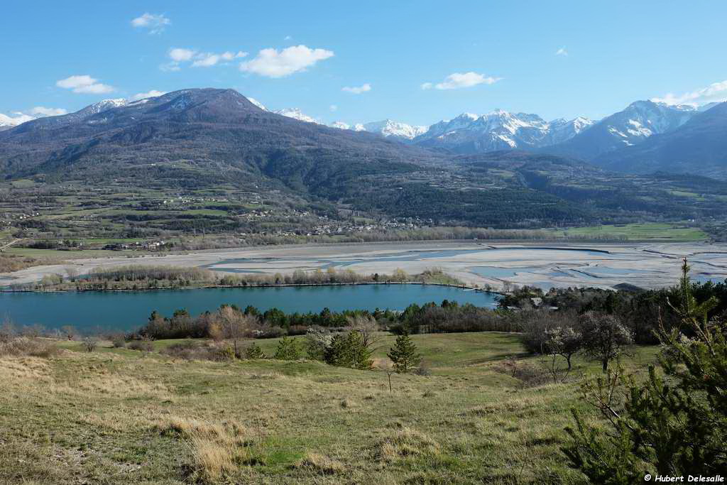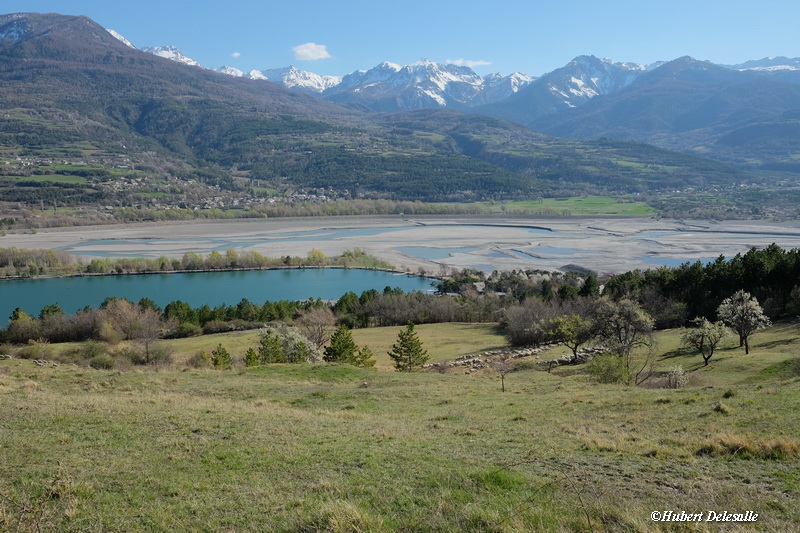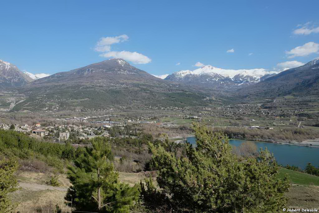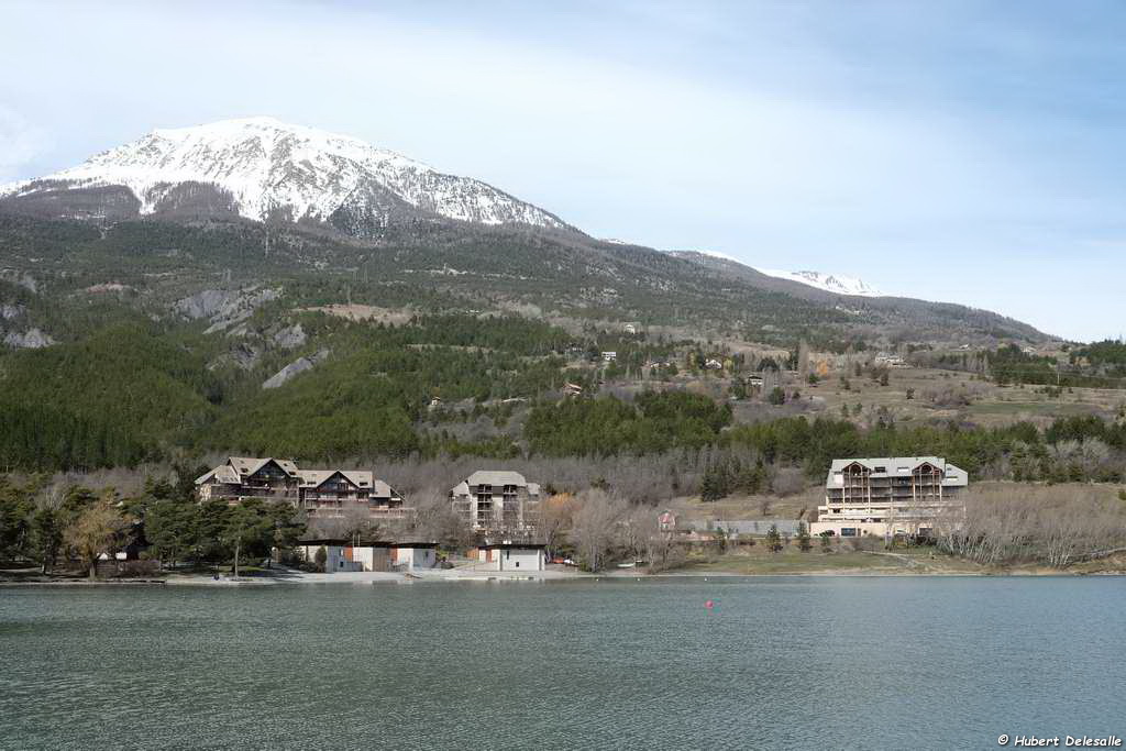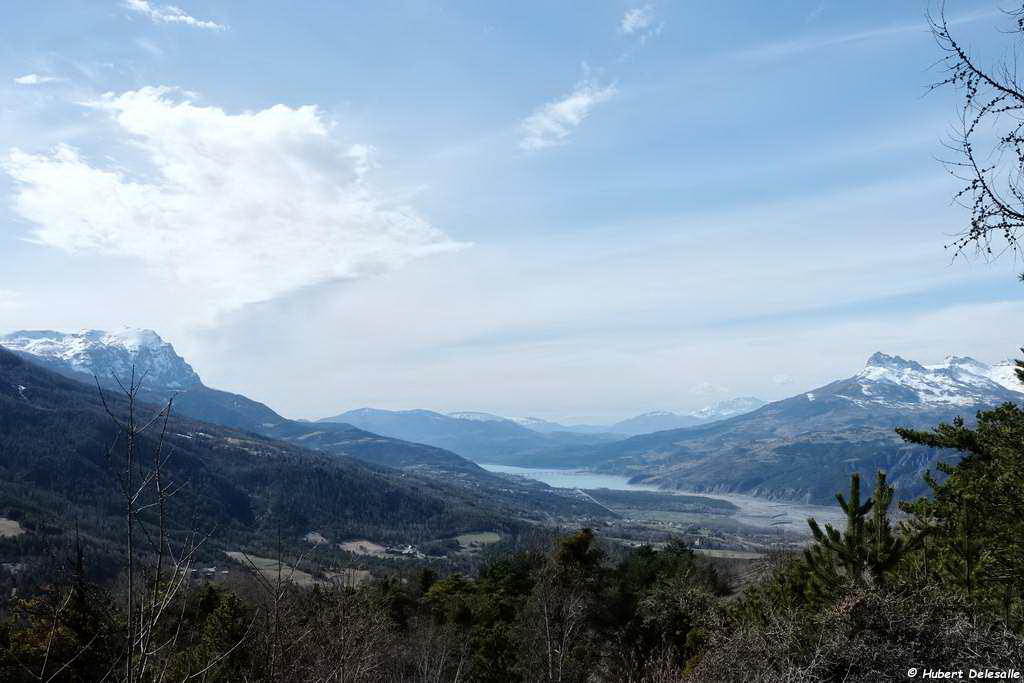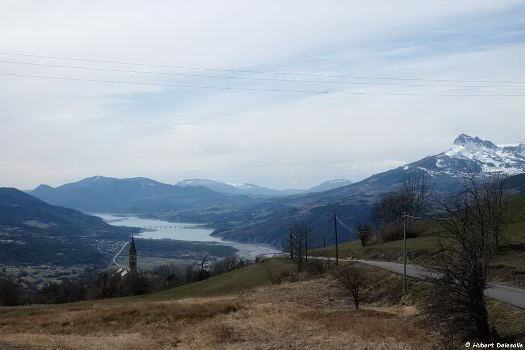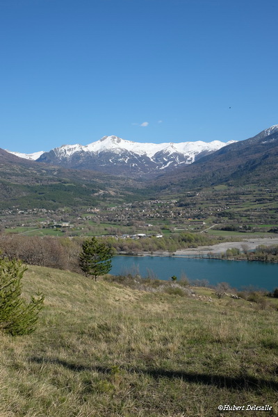 dominant la vallée de la Durance noyée maintenant par le lac de Serre-Ponçon.
