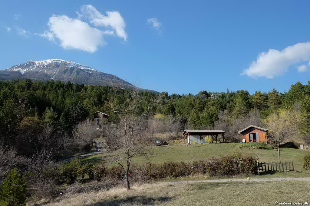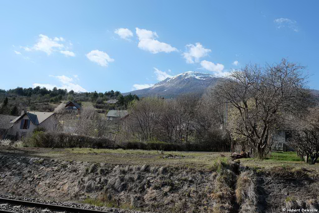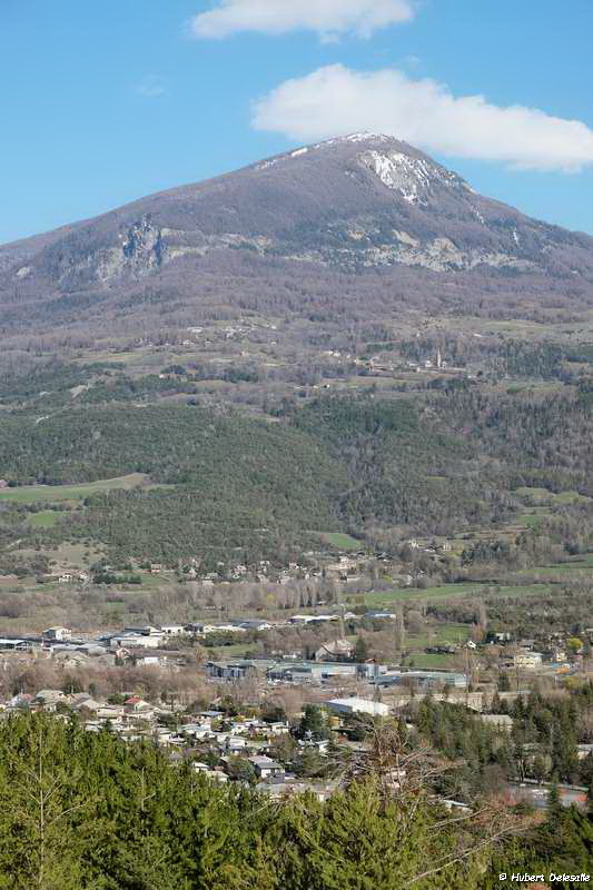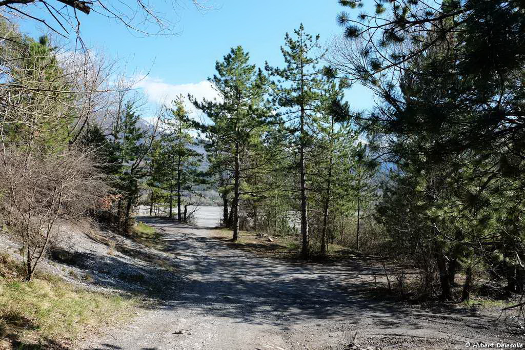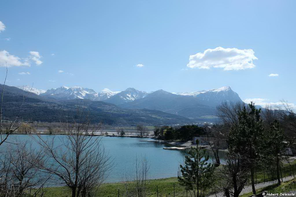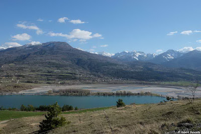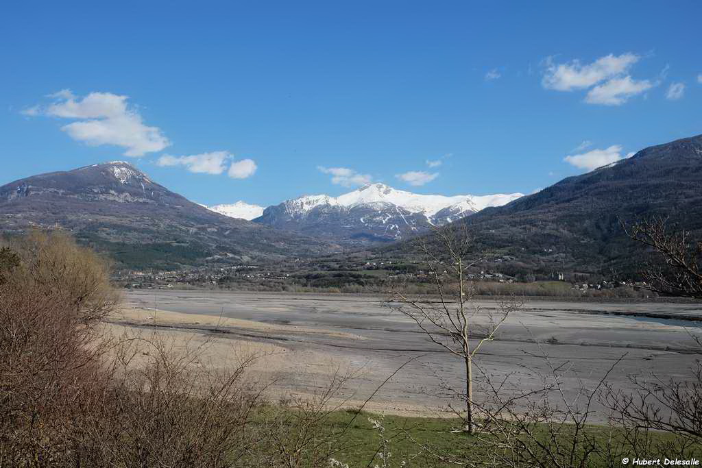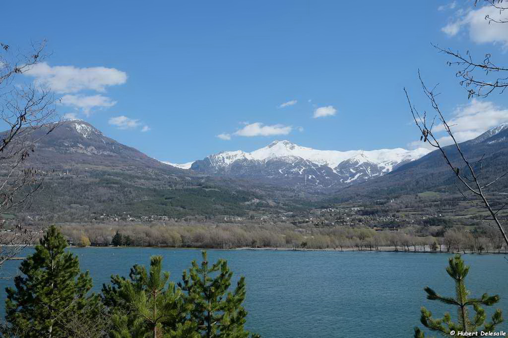 dominant la vallée de la Durance noyée maintenant par le lac de Serre-Ponçon.