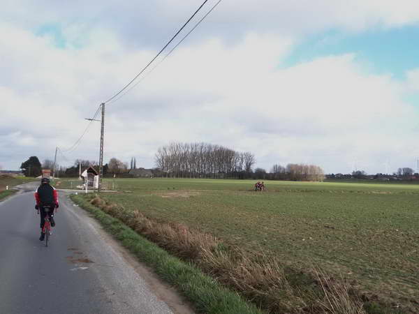 Randonnée en solo vers Steenwerck. Au départ de Bondues, je fais un bout de route avec un sympathique cyclo jusqu'à Warneton où je croise Pierre Dupont (qui rentre...) avec qui je fais un brin de causette, nous nous rappelons nos sympathiques randonnées du jeudi…. La lumière est magnifique, pas de chance, mon appareil photos ne s'allume pas !, batterie ? je mets celle de secours, non plus, bêtement, je ne pense pas à mon téléphone avant Messines! Et miracle, à Steenwercke il veut bien fonctionner ! A Nieuwkercke, les trois bistrots sont fermés, je prends donc ma pause au café de la Mairie à Steenwercke. Ensuite, je m'attarde près de Bois-Grenier sur le site de l'ancienne Chartreuse de Notre-Dame-des-Douleurs à la Boutillerie.